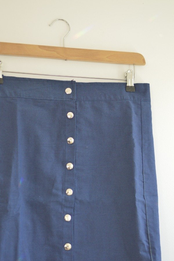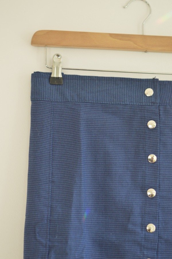 Falda corte recto con recortes de pinzas, frente con broches a presión.