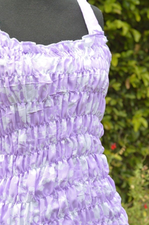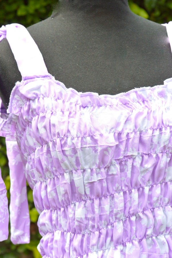 Este top upcycling es todo hecho con nido de abeja que es un recurso en el que se utiliza hilo elastico para crear el frunce en todo el cuerpo. El textil es de algodón estampado.