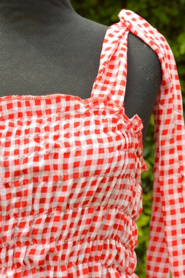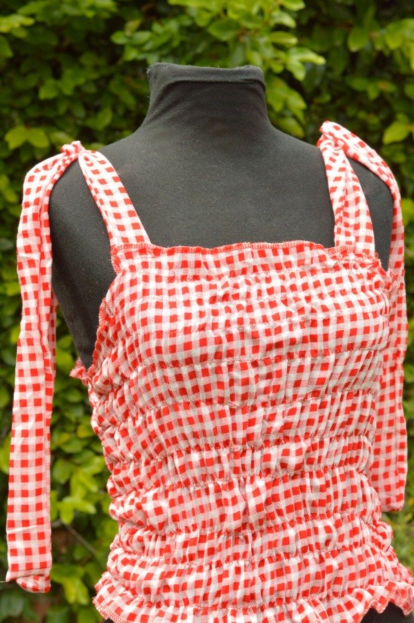 Este top upcycling es todo hecho con nido de abeja que es un recurso en el que se utiliza hilo elastico para crear el frunce en todo el cuerpo. El textil es de algodón cuadrille.