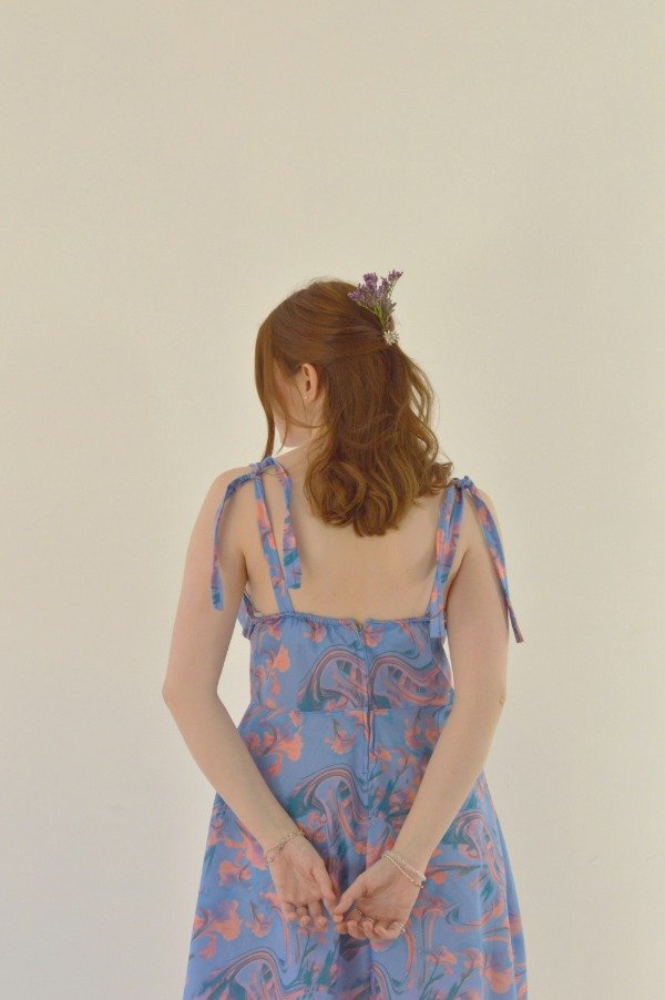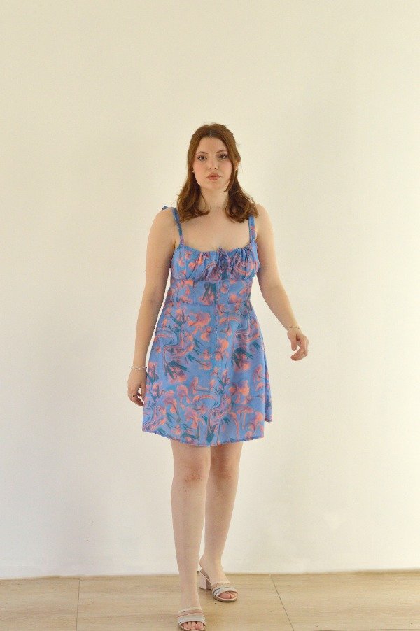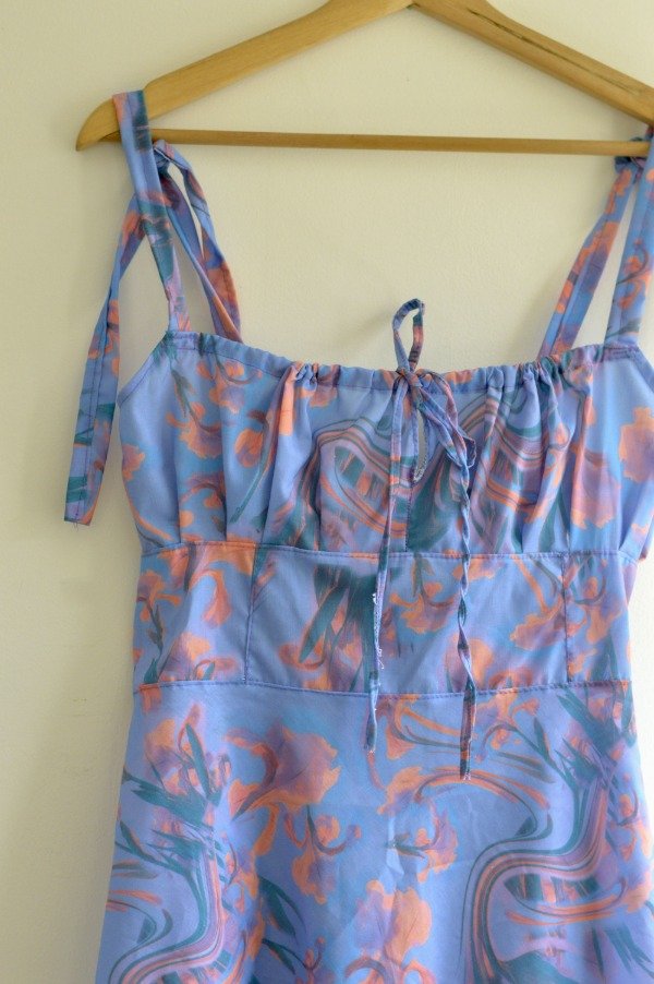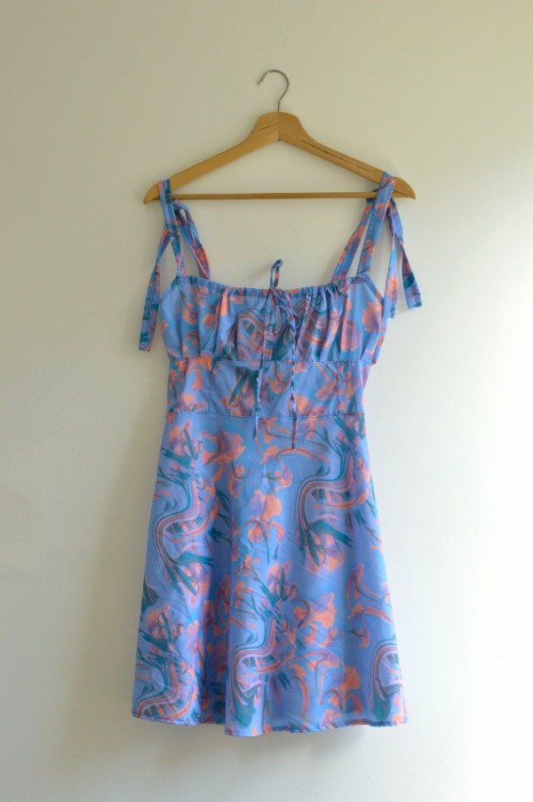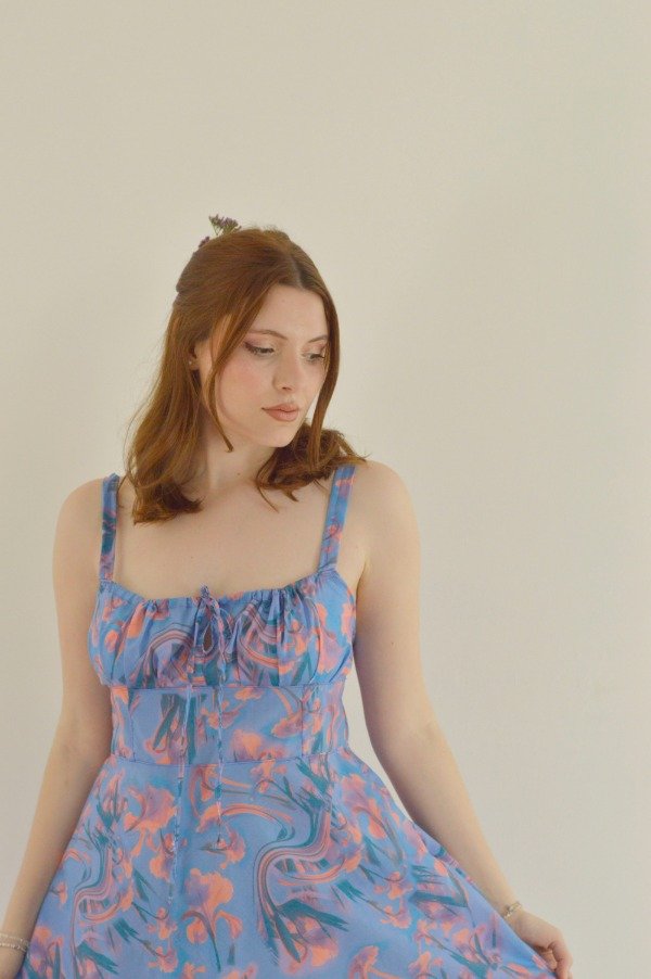 Tiene falda media campana, corte corsetero con busto fruncido. Tenes ajuste en los breteles y en el busto. La espalda tiene ajuste con un elástico y cierre hasta la falda.