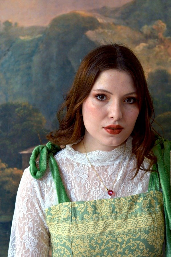 La molderia es la de siempre, pinzas rotadas, recortes de soporte en el ruedo y el escote, cintas de terciopelo regulables y espalda acordonada para ajustar.