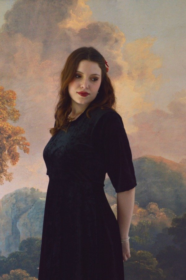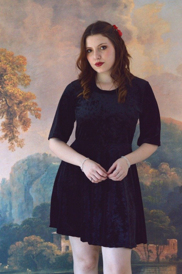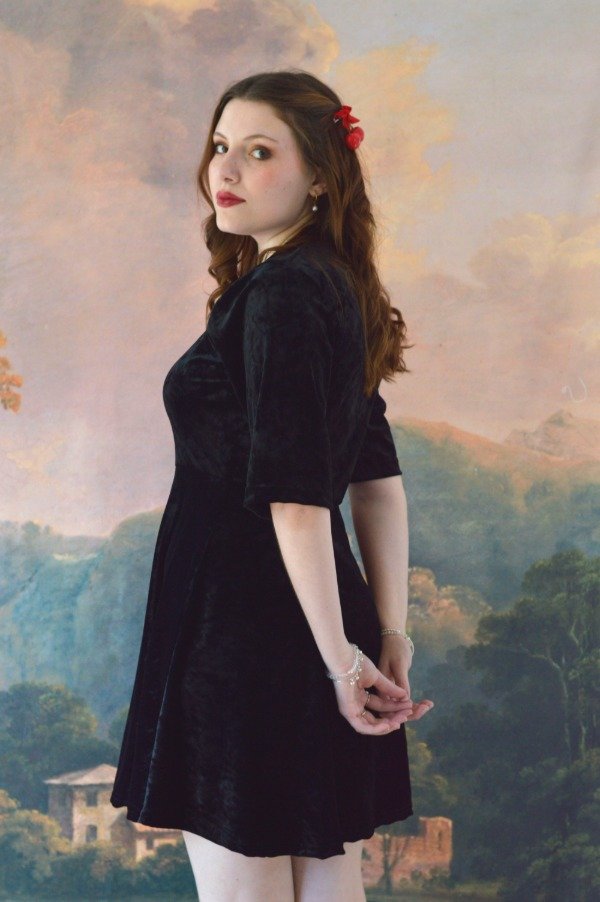 Este vestido de terciopelo/velvet negro tiene una caida y un peso hermoso, no solo destaca por el textil si no también por la molderia. Tenemos un escote redondo ideal para usar con prendas abajo en invierno y mangas amplias, que si bien no son acampanadas no ajustan al brazo para que puedas moverte con comodidad, la falda es 1/2 campana y tiene un vuelo increible.