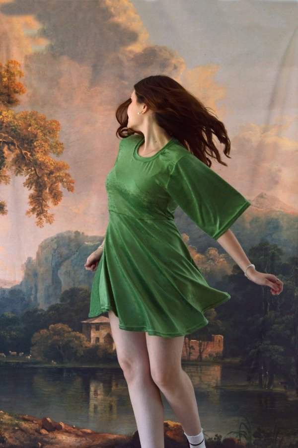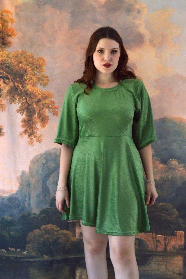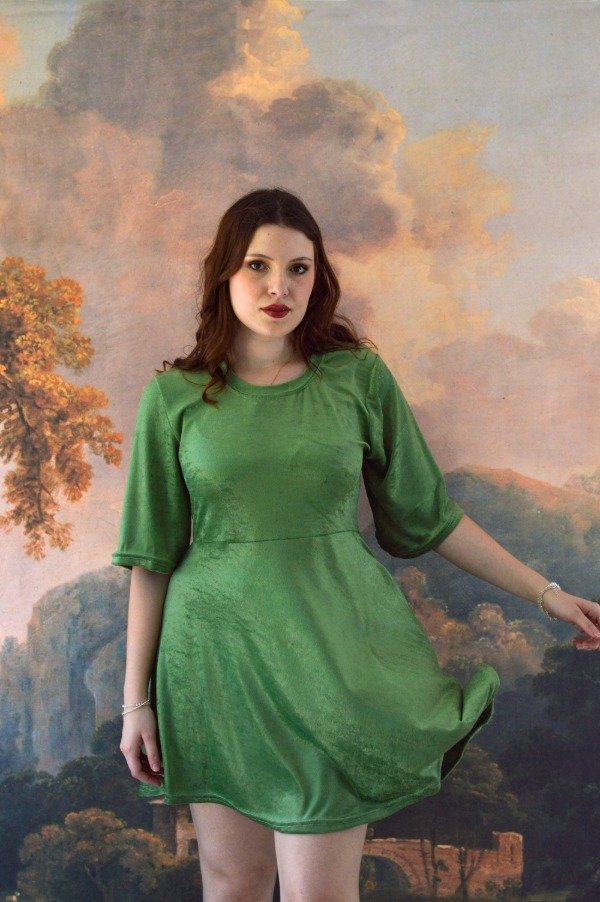 Este vestido de terciopelo/velvet verde tiene una caida y un peso hermoso, no solo destaca por el textil si no también por la molderia. Tenemos un escote redondo ideal para usar con prendas abajo en invierno y mangas amplias, que si bien no son acampanadas no ajustan al brazo para que puedas moverte con comodidad, la falda es 1/2 campana y tiene un vuelo increible.